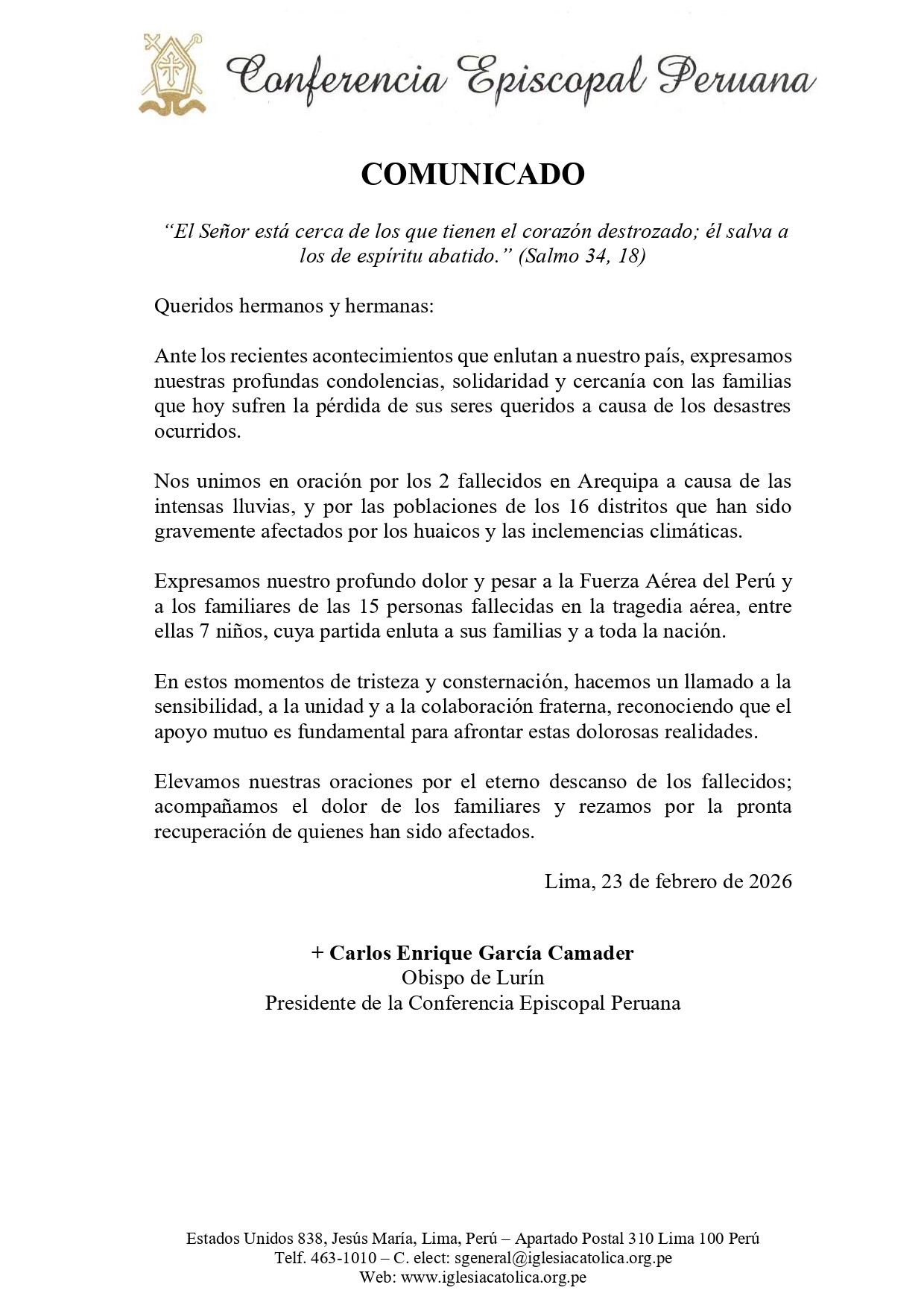 La Conferencia Episcopal Peruana dio a conocer el siguiente comunicado de Monseñor Carlos García Camader, Obispo de Lurín y presidente de la institución, ante los recientes acontecimientos que enlutan al país, expresando su cercanía con las familias afectadas por las intensas lluvias en Arequipa y por la tragedia aérea, e invitando a la oración y a la unidad en estos momentos de dolor.