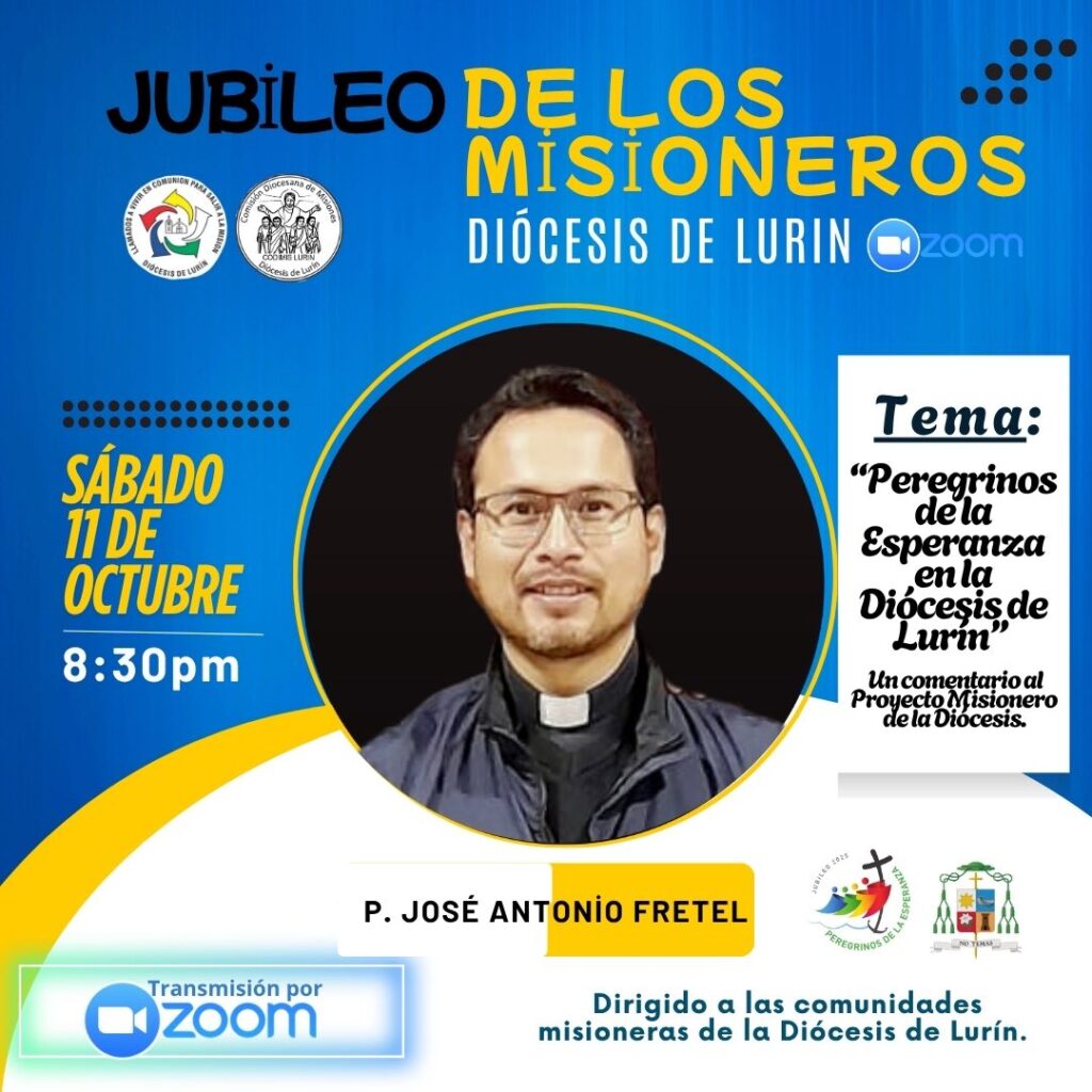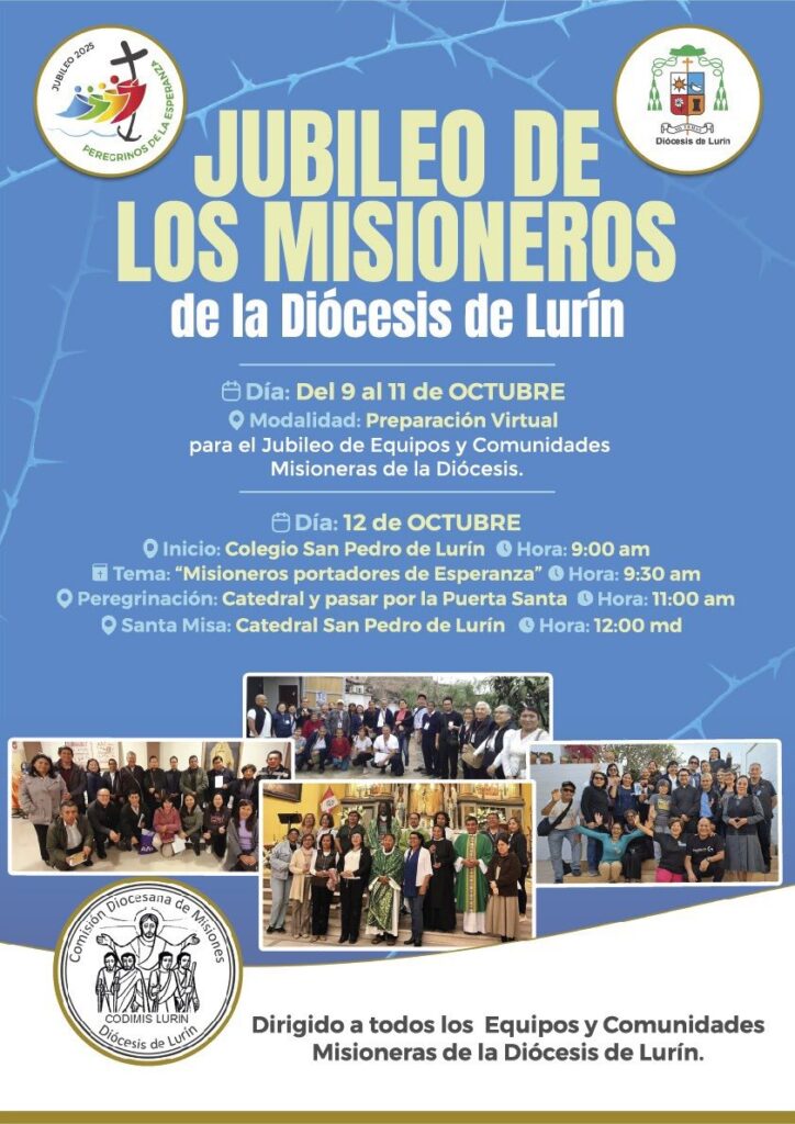 El sábado 12 de octubre se realizará la jornada central del Jubileo de los Misioneros. La cita será a las 9:00 a.m. en el Colegio San Pedro de Lurín, donde los participantes se reunirán para un tiempo de animación y reflexión bajo el tema “Misioneros portadores de Esperanza”.