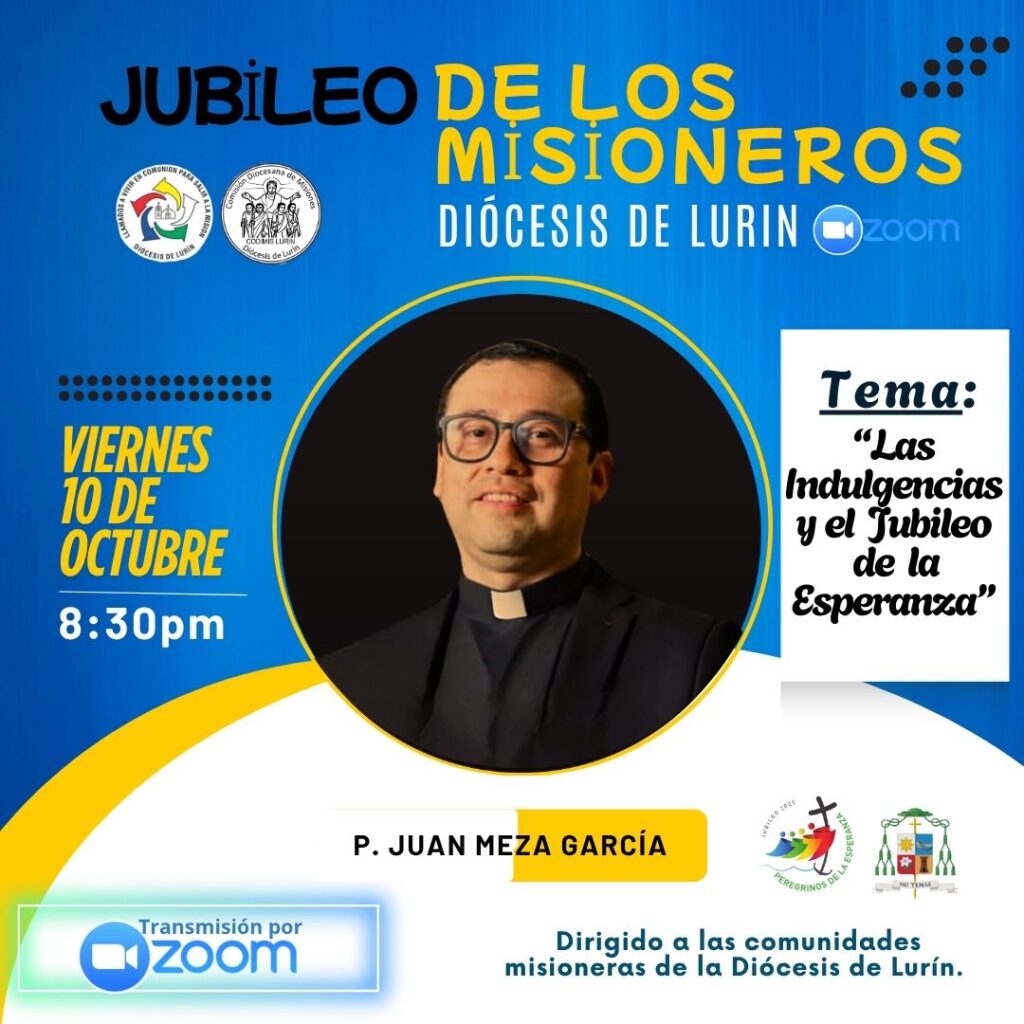 Uno de los momentos centrales será la conferencia virtual del viernes 10 de octubre, a las 8:30 p.m., a cargo del Padre Juan Meza García, quien abordará el tema “Las indulgencias y el Jubileo de la Esperanza”. Y culminará el sábado 11 de octubre en el mismo horario con la ponencia “Peregrinos de la esperanza en la Diócesis de Lurín”, con el comentario del Padre José Antonio Fretel.