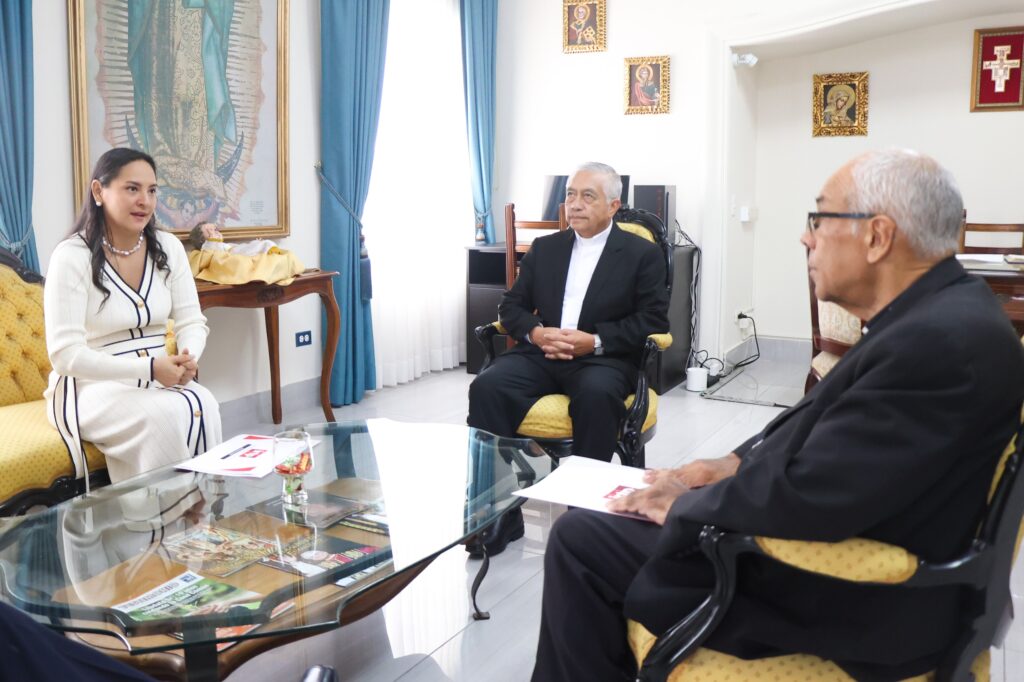 Monseñor Carlos García Camader, obispo de Lurín y presidente de la Conferencia Episcopal Peruana (CEP), recibió este jueves 26 de marzo, junto al Padre Guillermo Inca, Secretario General Adjunto, a una delegación del Instituto Nacional de Radio y Televisión del Perú (IRTP), la jefa Cinthya Ramírez; la directora de TV, Jeannie Torres; y el jefe de la Oficina de Comunicación e Imagen, Edgar Palomino.