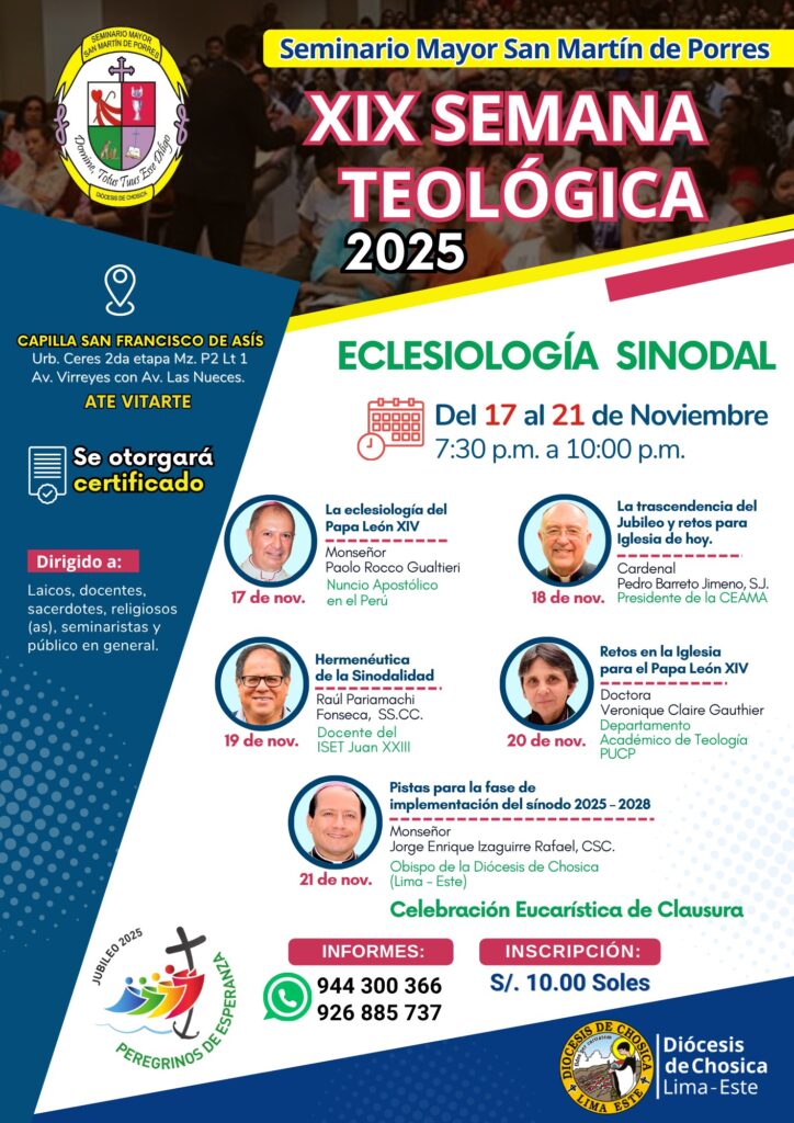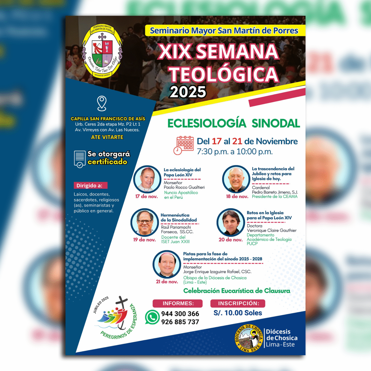 Del 17 al 21 de noviembre de 2025 se llevará a cabo la XIX Semana Teológica organizada por el Seminario Mayor San Martín de Porres de la Diócesis de Chosica, bajo el tema “Eclesiología Sinodal”. Este encuentro académico y pastoral busca ofrecer un espacio de reflexión sobre el sentido y la actualidad de la Sinodalidad en la Iglesia, en continuidad con el proceso iniciado durante el pontificado del Papa Francisco y proyectado ahora en el ministerio del Papa León XIV.