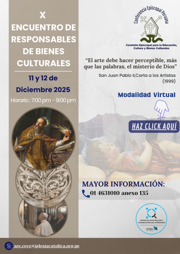 La Comisión Episcopal para la Educación, Cultura y Bienes Culturales de la Conferencia Episcopal Peruana llevará a cabo del 11 al 12 de diciembre, de manera virtual, el X Encuentro de responsables de Bienes Culturales. La asistencia es gratuita, vía zoom, y será transmitida en vivo por el Facebook de la comisión.